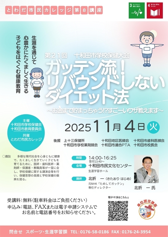多彩な講師陣をお迎えし、学習意欲の向上と生涯学習の推進を図ることを目的に「とわだ市民カレッジ」を開催いたします。 受講料は無料です。ご家族、ご友人をお誘いあわせのうえ、お気軽にお申し込みください。十和田市にお住まいでないかたも受講できます。