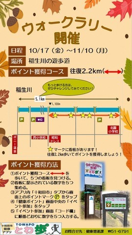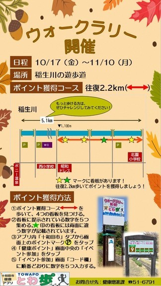 市内のウォーキングコースを歩きながら、コース内に散りばめられた5つの数字を集め、十和田市健康アプリ「とわ歩゜」のポイントを獲得できる「とわ歩゜ウォークラリー」を開催します!
