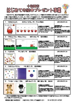 十和田市では、絵本の読み聞かせを通してお子さんとこころ触れ合う時間を大切に過ごしていただきたいと願って、赤ちゃん訪問の時に絵本を贈呈いたします。乳児期からの絵本の読み聞かせは、心の安らぎや親子の絆を深め、子どもたちの成長や笑顔につながります。