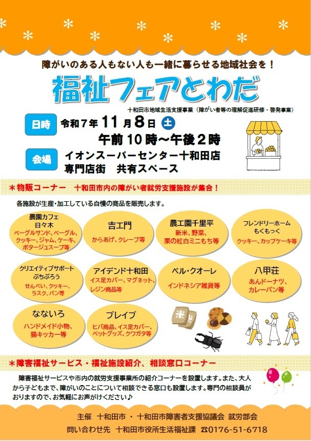 市では、共生社会の実現に向けて、障がい者などに対する地域の皆さんの理解を深めるために、市内の福祉施設などの紹介や活動内容の掲示、生産物の販売などを行います。お誘い合わせの上、お気軽にお越しください。