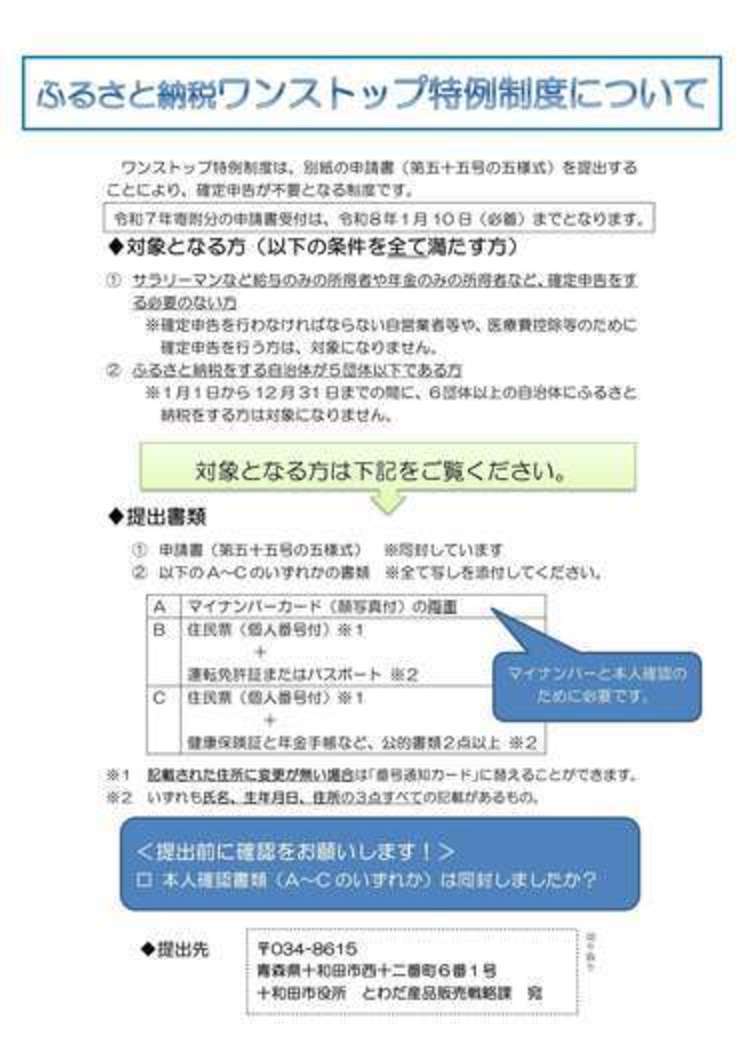 ワンストップ特例申請書の提出期限は令和8年1月10日必着です。
