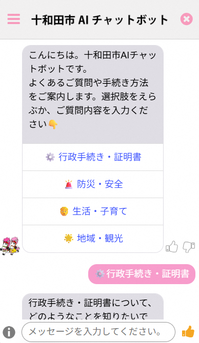 - 表示された選択肢の中から、聞きたい内容をクリックするか、下部の「メッセージを入力してください。」と書かれている部分に、質問内容を入力し、送信してください。